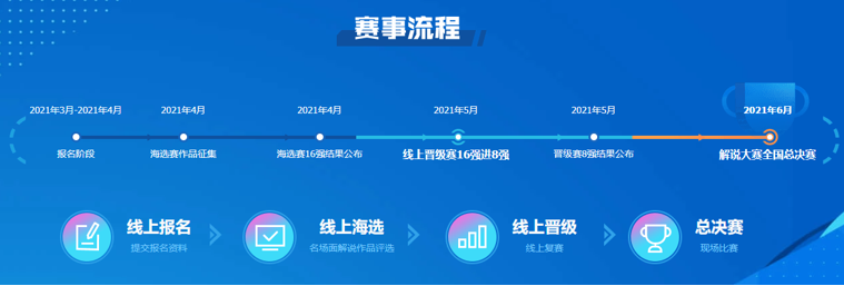 本届大赛分为海选赛、线上晋级赛、总决赛三个阶段,2021年3月~4月为报名阶段,4月底将公布16强结果,5月份将进行8强赛,大赛将在6月进行总决赛,更专业的赛制全方位考验选手的综合能力