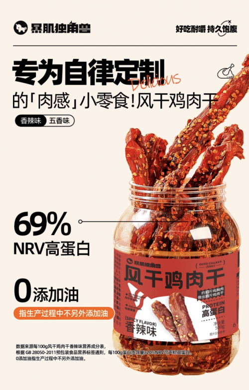暴肌独角兽风干鸡肉干以“好吃耐嚼、持久饱腹”为核心卖点,精准解决了减脂人群“想吃肉又怕胖”的痛点。产品推出香辣、五香两种经典口味,满足不同人群的味蕾需求:香辣味椒香四溢且带着轻麻微辣的层次感,吃起来毫无负担;五香味则以浓郁辛香为基调,咸淡适口,即使是不嗜辣的人群也能轻松接受。