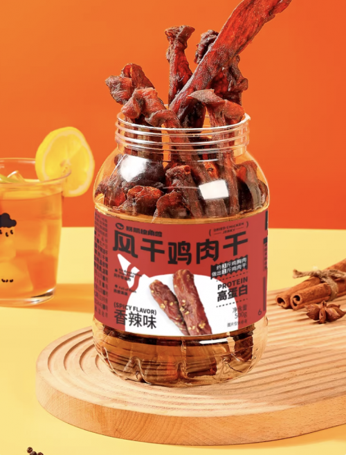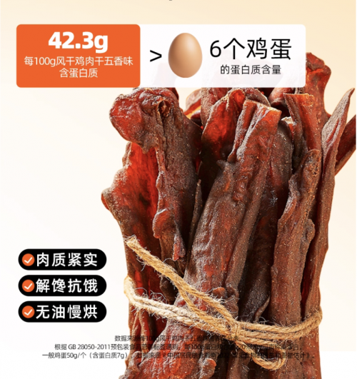 高营养更是该产品的“加分项”。其中,每100g香辣味风干鸡肉干的NRV(营养素参考值)高蛋白含量达69%,五香味每100g含蛋白质42.3g,相当于超过6个中等大小鸡蛋的蛋白质总量(按每颗鸡蛋约6-7克蛋白质计算),实现了“3 倍高蛋白”的营养优势。对于健身减脂人群而言,充足的蛋白质不仅能增强饱腹感、减少正餐外的热量摄入,还能帮助维持肌肉量,避免减脂期间出现肌肉流失的问题。